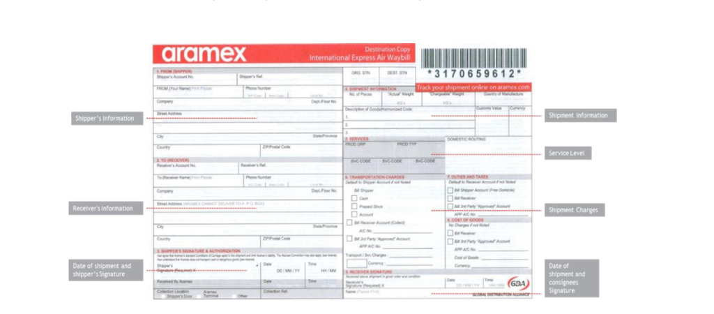 The AWB acts as proof of shipment and enables tracking throughout the delivery journey. Aramex customers can use Airwaybill-based shipping that is generated via Aramex.com or the ClickToShip application. It must include the following: